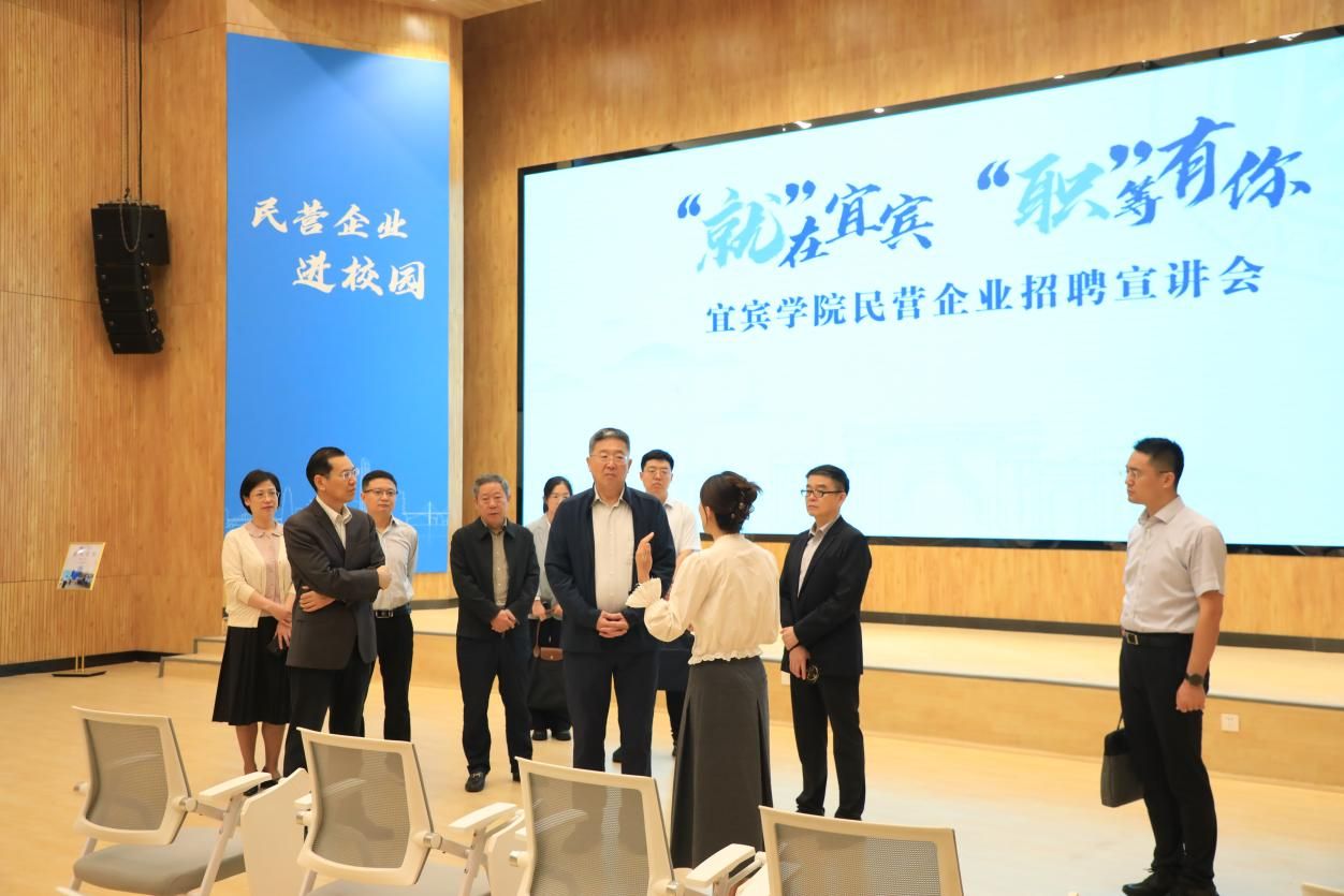 会前,调研组参观宜宾学院求实会堂,深入学习习近平总书记来校视察重要指示精神,了解学校人才培养、产教融合等相关情况,参观了毕业生就业情况展台、模拟垃圾智能分类运输机器人展台、智慧农业物联网监控系统、油樟萃取精馏装置、就业创业指导服务展台及招聘宣讲会现场。