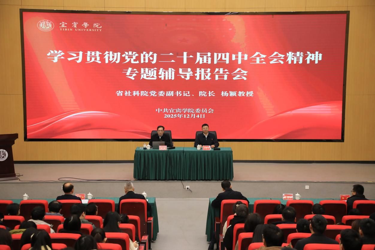 12月4日,学习贯彻党的二十届四中全会精神专题辅导报告会在临港校区求实会堂举行。四川省社会科学院党委副书记、院长、省委宣讲团成员杨颖作专题报告。校领导、党委常委,学校中层领导干部,统战人士代表,思政课教师代表,专职辅导员代表,各二级学院(部)师生党员代表约300余人参加宣讲会。报告会由宜宾学院党委副书记蒋道平主持。