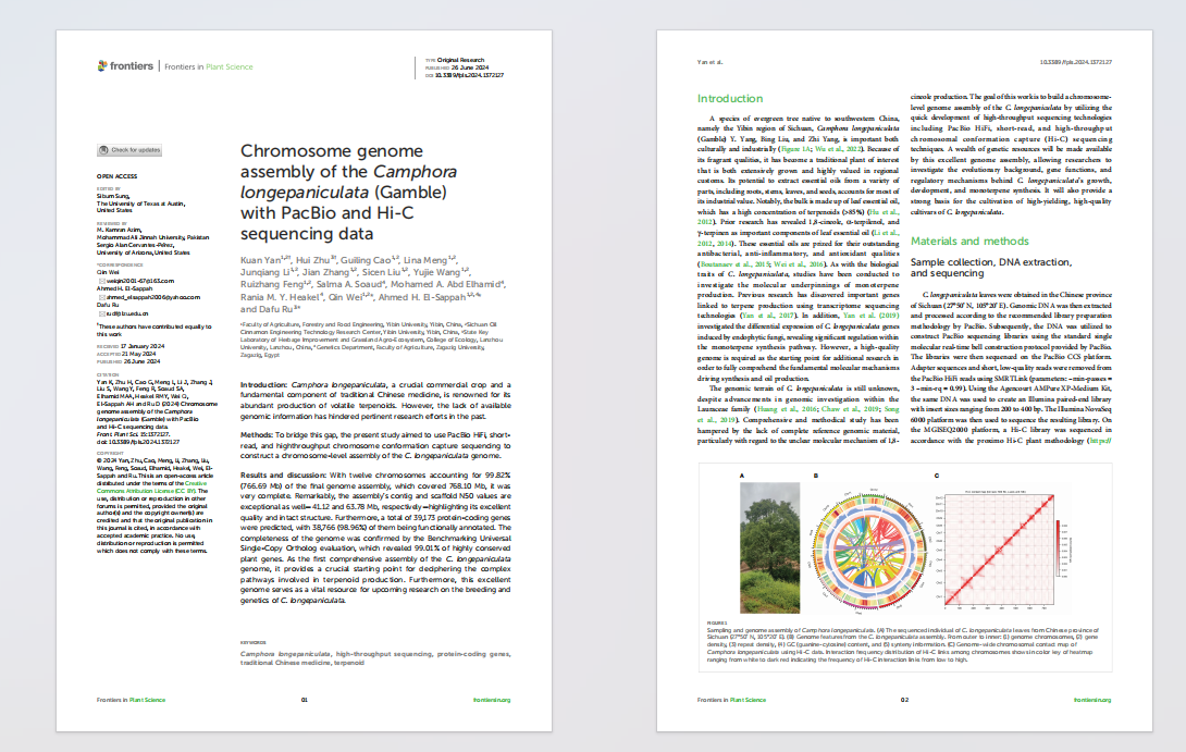 近日,宜宾学院农林与食品工程学部严宽,四川省油樟工程技术研究中心主任魏琴等教师的学术论文《Chromosome genome assembly of the Camphora longepaniculata (Gamble) with PacBio and Hi-C sequencing data》(《油樟染色体基因组组装与注释》)在《Frontiers in Plant Science》(《植物科学前沿》)上在线发表。