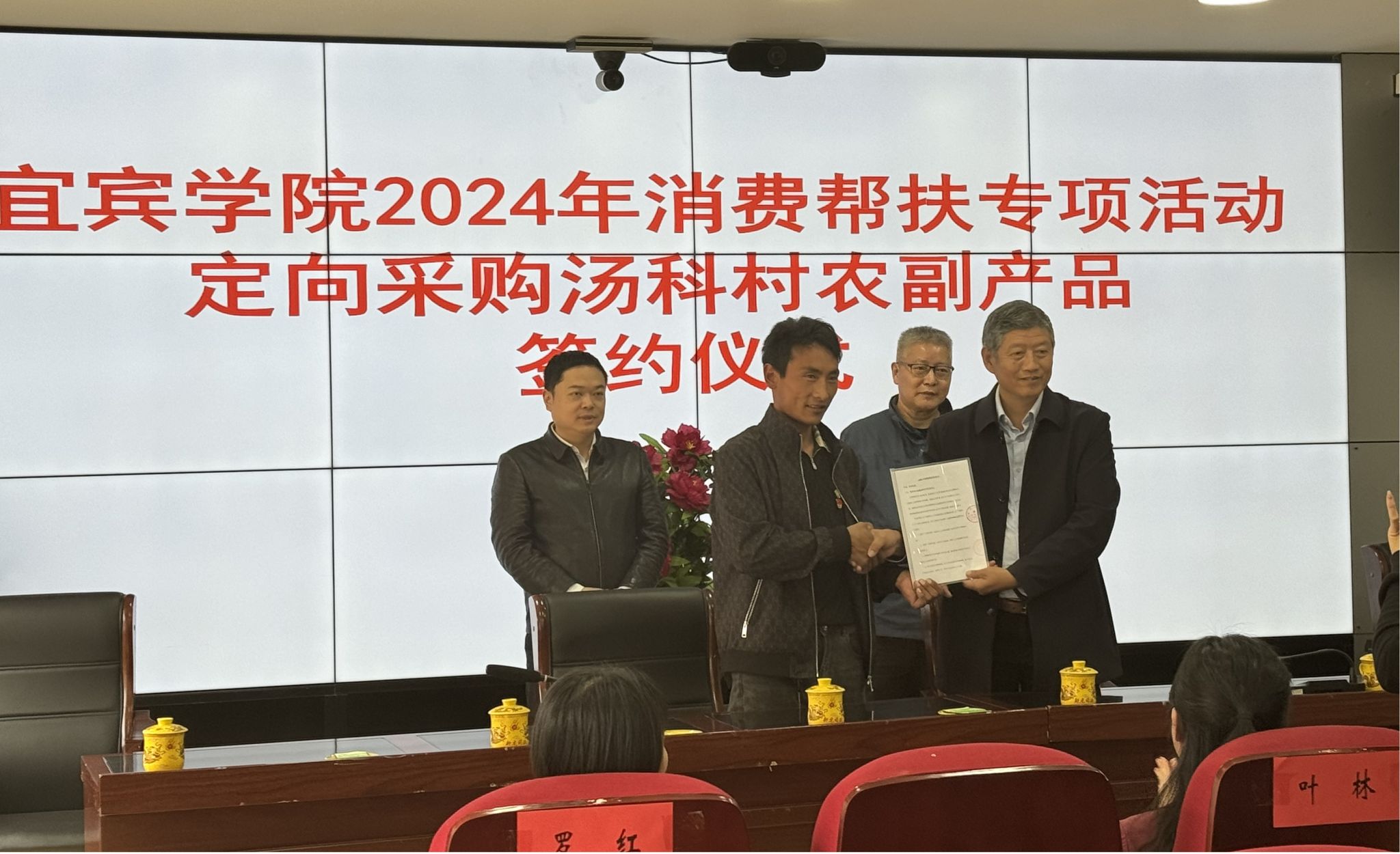 华曦代表学校与汤科村签订了消费帮扶采购协议,与汤科村两户监测户签订了宜宾学院公益岗位就业合同,向汤科村发放了宜宾学院捐赠的环卫物资。