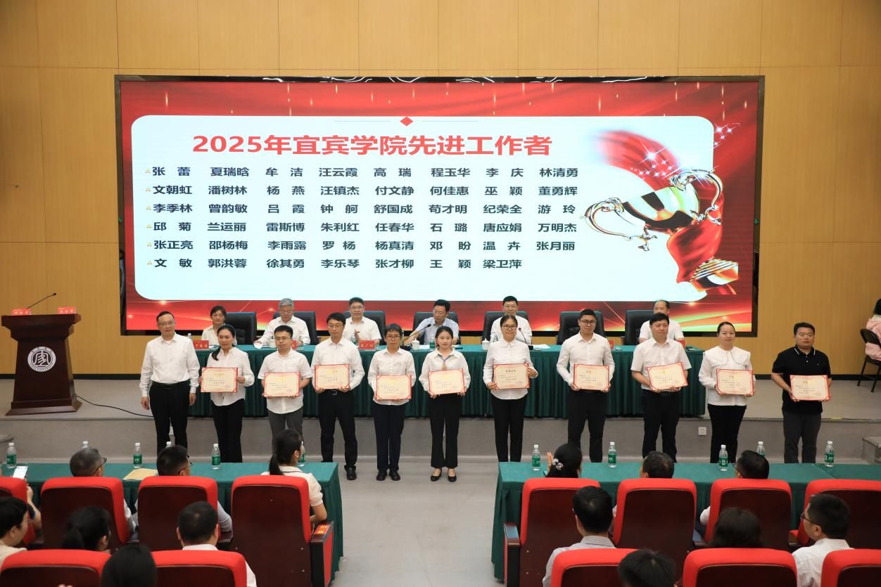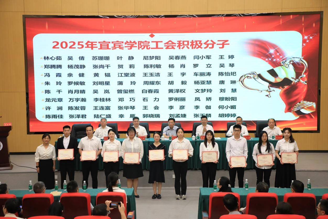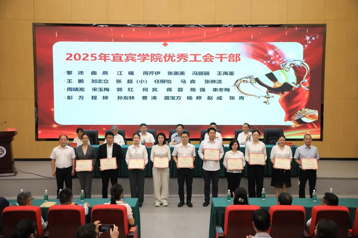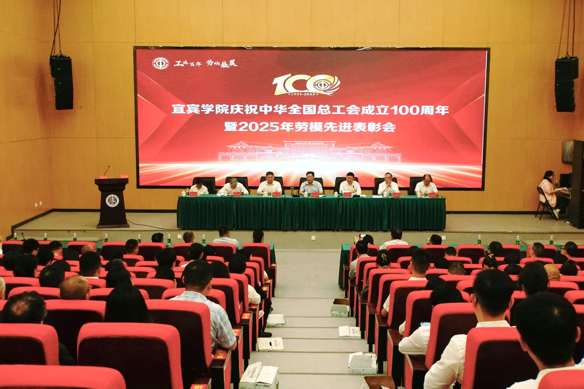 5月7日下午,宜宾学院庆祝中华全国总工会成立100周年暨2025年劳模先进表彰会在临港校区求实会堂召开。校领导、党委常委出席会议。学校工会专兼职副主席、工会委员,二级工会主席,受表彰的集体和个人参会。会议由党委副书记蒋道平主持。