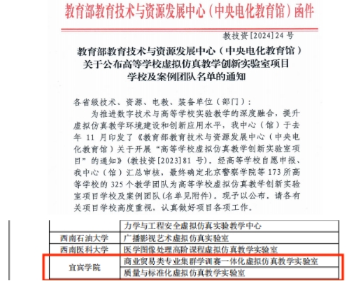 近日,宜宾学院成功入选为高等学校虚拟仿真教学创新实验室项目学校,质量管理与检验检测学部的“质量与标准化虚拟仿真教学实验室”、经济与工商管理学部的“商业贸易类专业集群学训赛一体化虚拟仿真教学实验室”入选高等学校虚拟仿真教学创新实验室项目案例团队,这是学校在虚拟仿真实验教学建设上取得的新突破。全国共有173所高校和375个教学团队入选。