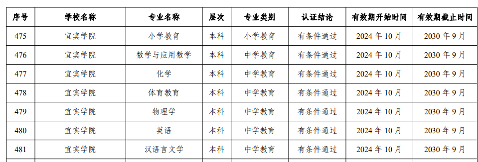 近日,教育部办公厅发布了《关于公布2024年通过普通高等学校师范类专业认证及认证中期审核专业名单的通知》(教师厅函〔2024〕20号)。宜宾学院小学教育、数学与应用数学、化学、体育教育、物理学、英语、汉语言文学7个专业顺利通过师范类专业第二级认证,有效期六年,自2024年10月起至2030年9月止。