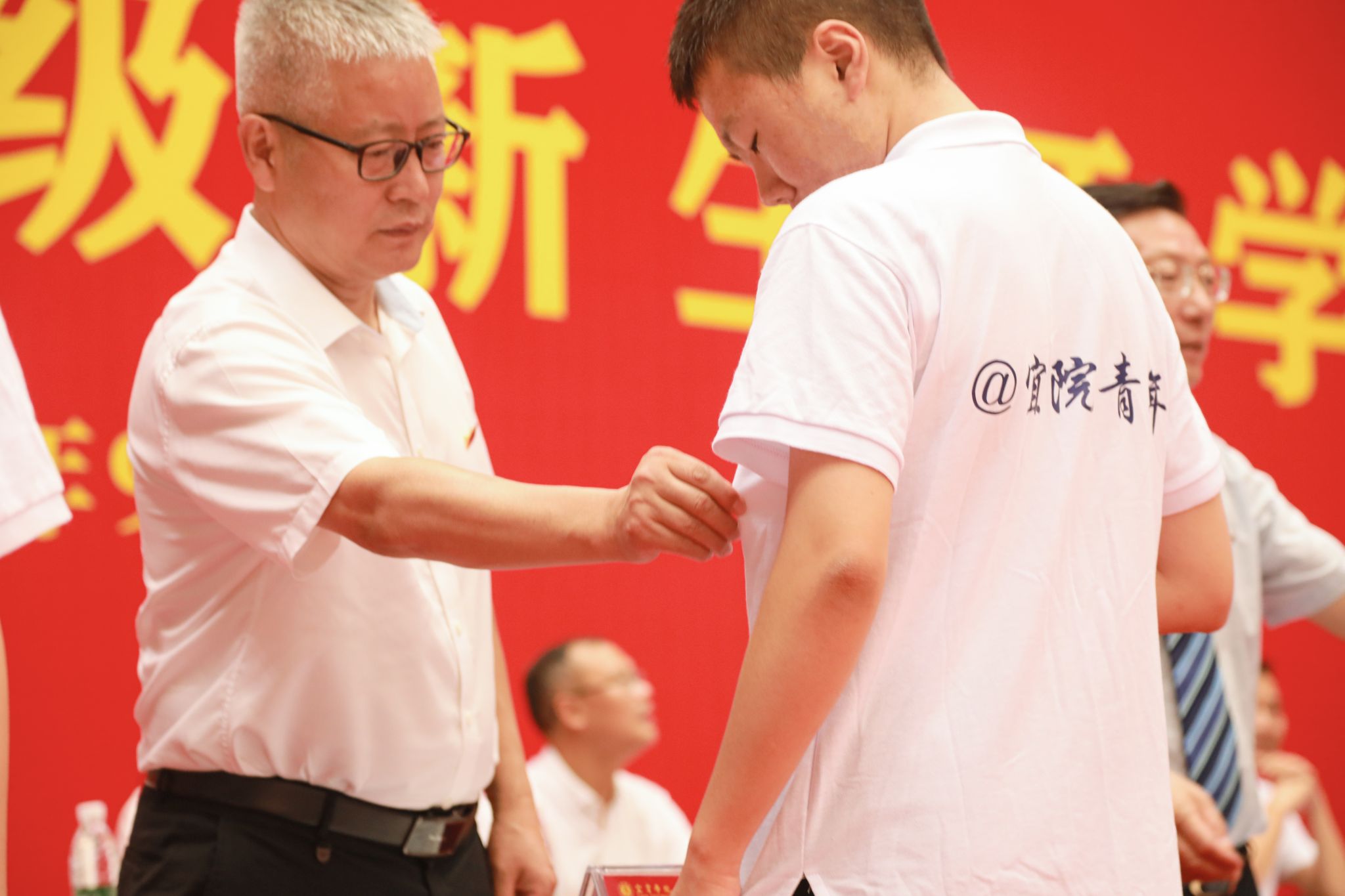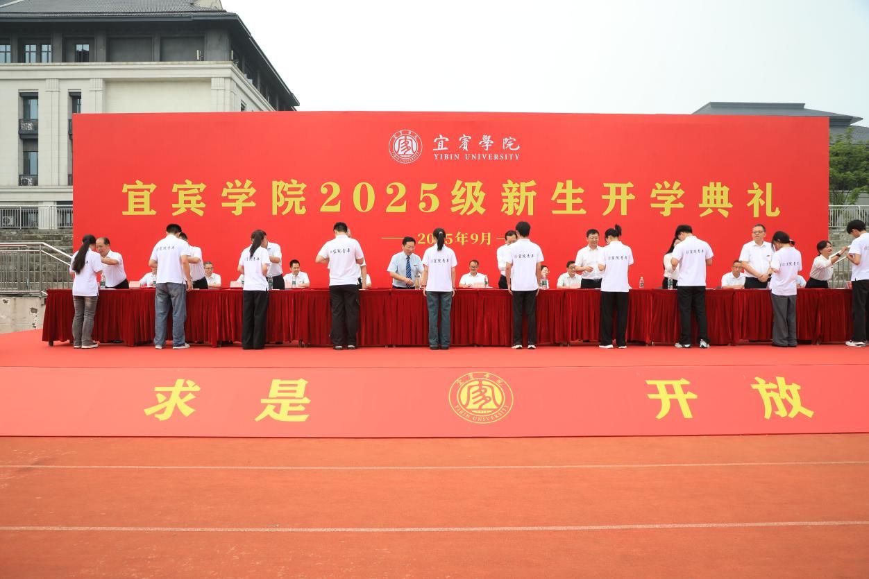在佩戴校徽仪式中,校领导为新生代表授予校徽,全体新生郑重地将校徽佩戴于胸前,标志着他们正式成为宜宾学院的一员。校徽不仅代表着身份,更承载着“自强不息、至善致远”的宜宾学院精神和“求实、求是、开放、创新”的校训品格。