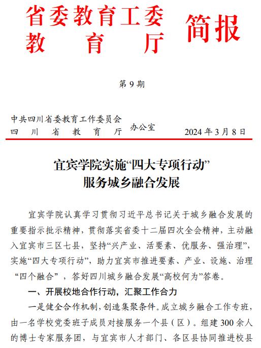 近年来,宜宾学院深入贯彻落实中央和省委关于城乡融合发展的决策部署,主动融入宜宾市七县三区经济社会发展,高质量服务宜宾城乡融合,以“兴产业、活要素、优服务、强治理”为目标实施了“四大专项行动”。3月8日,《省委教育工委、教育厅简报》第9期对此进行了专题报道。