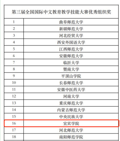 本届大赛共吸引了全国126所高校的484名选手参赛,涵盖本科生、研究生、留学生三个赛道。比赛设置说课、试讲、中英文问答及中华才艺展示四个环节,经过复赛与决赛两轮激烈角逐,最终评选出一、二、三等奖、优秀奖及语音教学专项奖。其中,本科生赛道260名选手中共57人晋级决赛,留学生赛道61名选手中共13人晋级。我校外国语学院4名汉语国际教育专业的中国学生和2名留学生参赛。选手们在赛场上表现优异,取得了可喜的成绩:本科生组中,邓海琴、葛新欣荣获大赛“三等奖”,唐瑶、王佳怡获得“优秀奖”;留学生组中,杨雅(LAONY BOUYA)获得“三等奖”,并斩获大赛特设的“语音教学专项奖”,王焰(THAMLASIN SOUKANYA)获“优秀奖”。指导教师朱洪辉荣获“杰出指导教师奖”与“优秀指导教师奖”双项荣誉。宜宾学院作为参赛单位,荣获“优秀组织奖”。