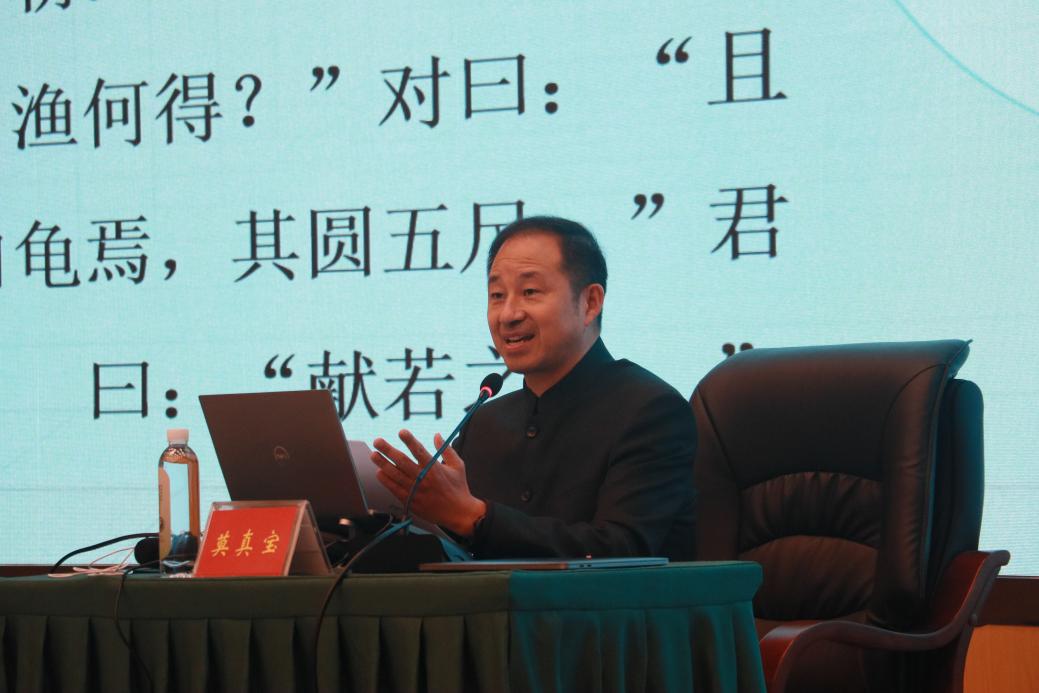 讲座期间,莫真宝主任聚焦人生困境的破解与精神境界的提升,从庄子所处时代的经济社会悖论入手,清晰剖析了古今共通的生存矛盾与人生困惑。随后,他依托“庖丁解牛”“逍遥游”等经典寓言及文献典籍,逐步深入阐释庄子的处世智慧与脱困之道。既解读出“以无厚入有间”的顺应规律之法、“鹓鶵非梧桐不栖”的品格坚守之道,又借助大鹏意象生动传递出突破外界束缚、追求精神绝对自由的理想境界。同时,他结合毛泽东诗词以及历代文人对庄子思想的接受实例,追溯庄子智慧深厚的文化影响力,寄语师生以豁达心态直面生活与学习中的各类挑战,在探索前行中找寻内心的平静与专属“逍遥”。