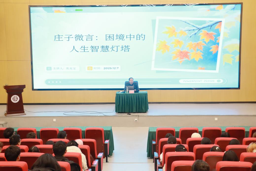 为传承中华优秀传统文化,助力师生从古典哲学中汲取人生智慧、涵养精神品格,12月7日,由院团委主办,院学生会、学生团委承办的“宜院之声”主题讲座于求实会堂顺利举办。本次讲座特邀国务院参事室中央文史研究馆研究中心诗词研究部主任、中华诗词学会常务理事、文学博士莫真宝担任主讲嘉宾,以《面对困境的人生智慧——庄子微言》为主题进行深度分享,党委书记马洪江出席相关活动。讲座现场座无虚席,氛围热烈,师生齐聚一堂,共赴学术盛宴。