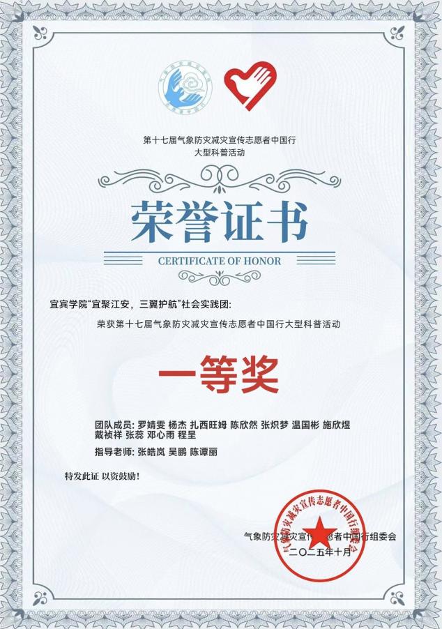 近日,由中国气象局、教育部、共青团中央、中国科学技术协会联合组织的第十七届“气象防灾减灾宣传志愿者中国行”活动获奖名单正式揭晓。作为全国气象科普领域的标杆性项目,本届活动聚焦“普及气象防灾知识,夯实基层安全根基”,吸引全国高校实践团队广泛参与。本次赛事全国共入围243支团队,其中35支团队晋级优秀团队评选,竞争十分激烈。宜宾学院“宜聚江安·三翼护航”社会实践团凭借专业扎实的实践成果与创新多元的科普形式,从全国众多高校团队中脱颖而出,成功斩获全国一等奖,用实干精神书写青春担当。