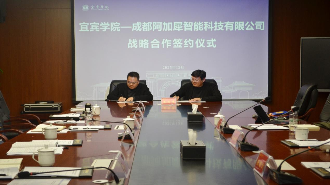 随后,双方举行了签约仪式。杨强与孙晓刚分别代表宜宾学院与成都阿加犀智能科技有限公司签署了战略合作协议,标志着双方正式建立合作关系。