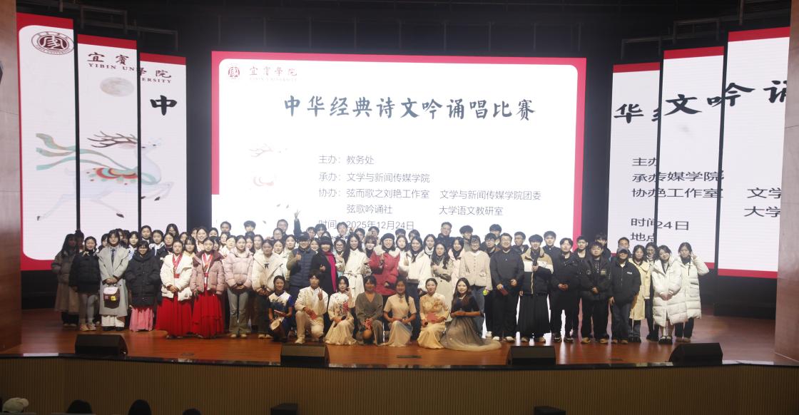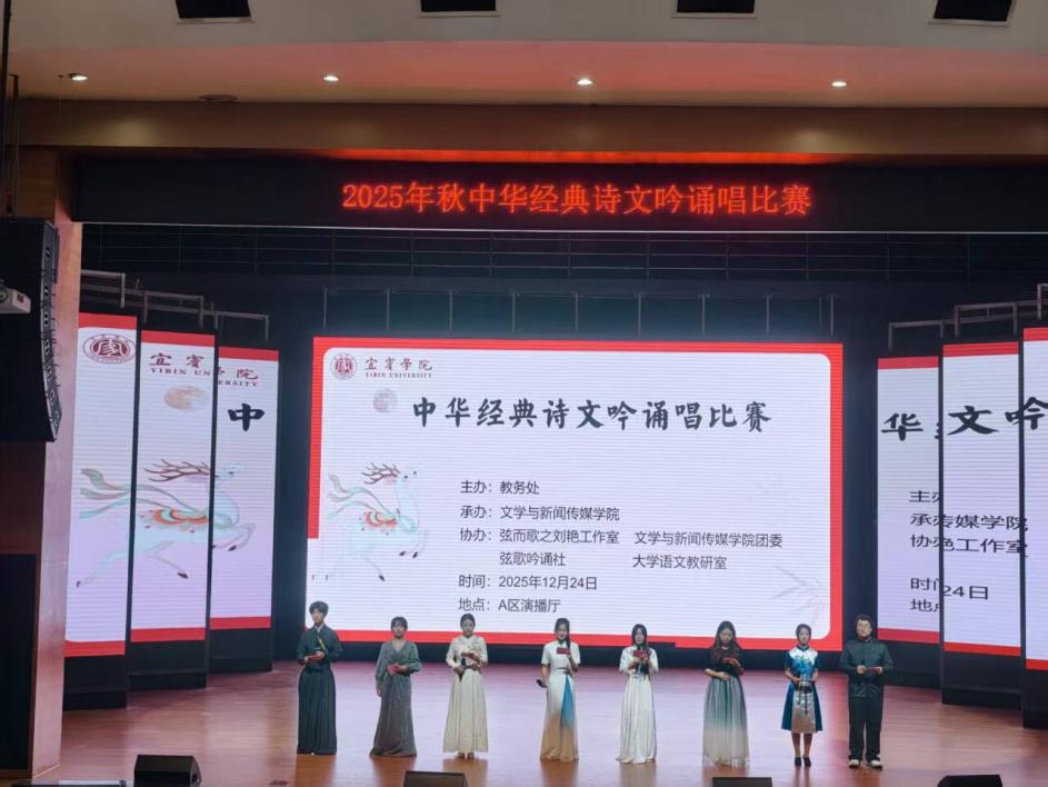 为传承中华优秀传统文化,感悟经典诗文的不朽魅力,12月24日下午,学校在A区演播厅举办2025年秋季中华经典诗文吟诵唱比赛。本次比赛由宜宾学院教务处主办,文学与新闻传媒学院承办,弦而歌之刘艳工作室、文学与新闻传媒学院团委、弦歌吟诵社、大学语文教研室协办。本次比赛共有16支优秀团队参赛,他们以中华民族传统读书法——吟诵展现了中华优秀传统文化的深厚内涵与艺术魅力。