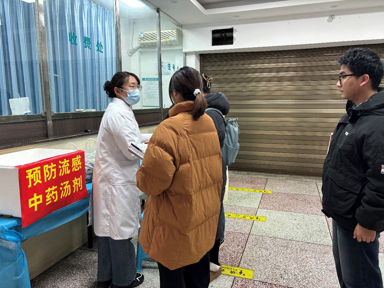 “入口有点苦,但是有回甘,比想象的好喝很多,感谢你们辛苦熬制。”一位来自经管学院大二的同学早早来到医务室领取汤剂。发放汤剂的同时,现场的医务人员向前来领药的师生耐心细致地宣传流感预防知识,例如勤洗手、保持室内通风;避免去人群密集的场所;不熬夜,保证充足睡眠;在公共场所佩戴口罩;建议接种流感疫苗。一旦出现发热、咳嗽、咽痛等流感症状,不要带病上班或上学,应及时戴好口罩前往医院就诊。