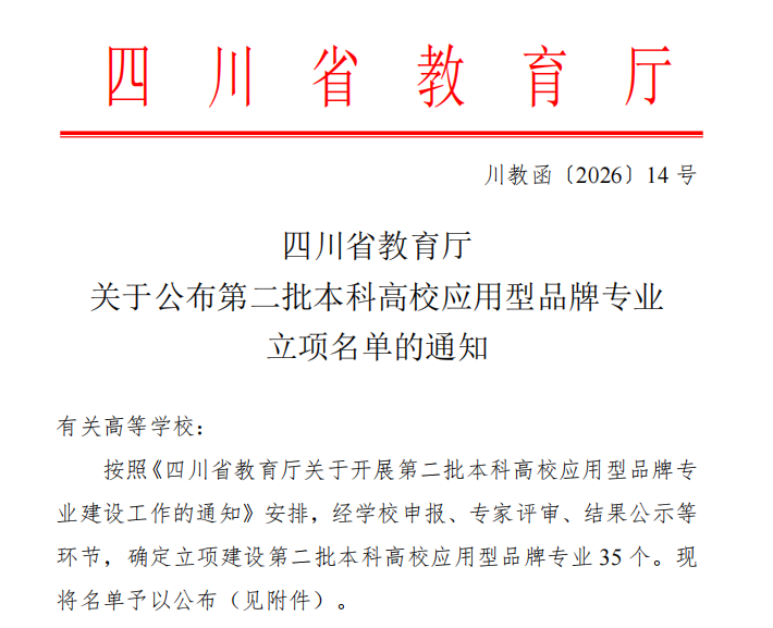 近日,四川省教育厅正式公布第二批本科高校应用型品牌专业立项名单,我校申报的机械电子工程专业成功获批成为学校第二个省级应用型品牌专业,标志着学校在应用型人才培养、专业内涵建设领域取得新的进展,为服务区域产业发展、提升办学核心竞争力奠定了坚实基础。
