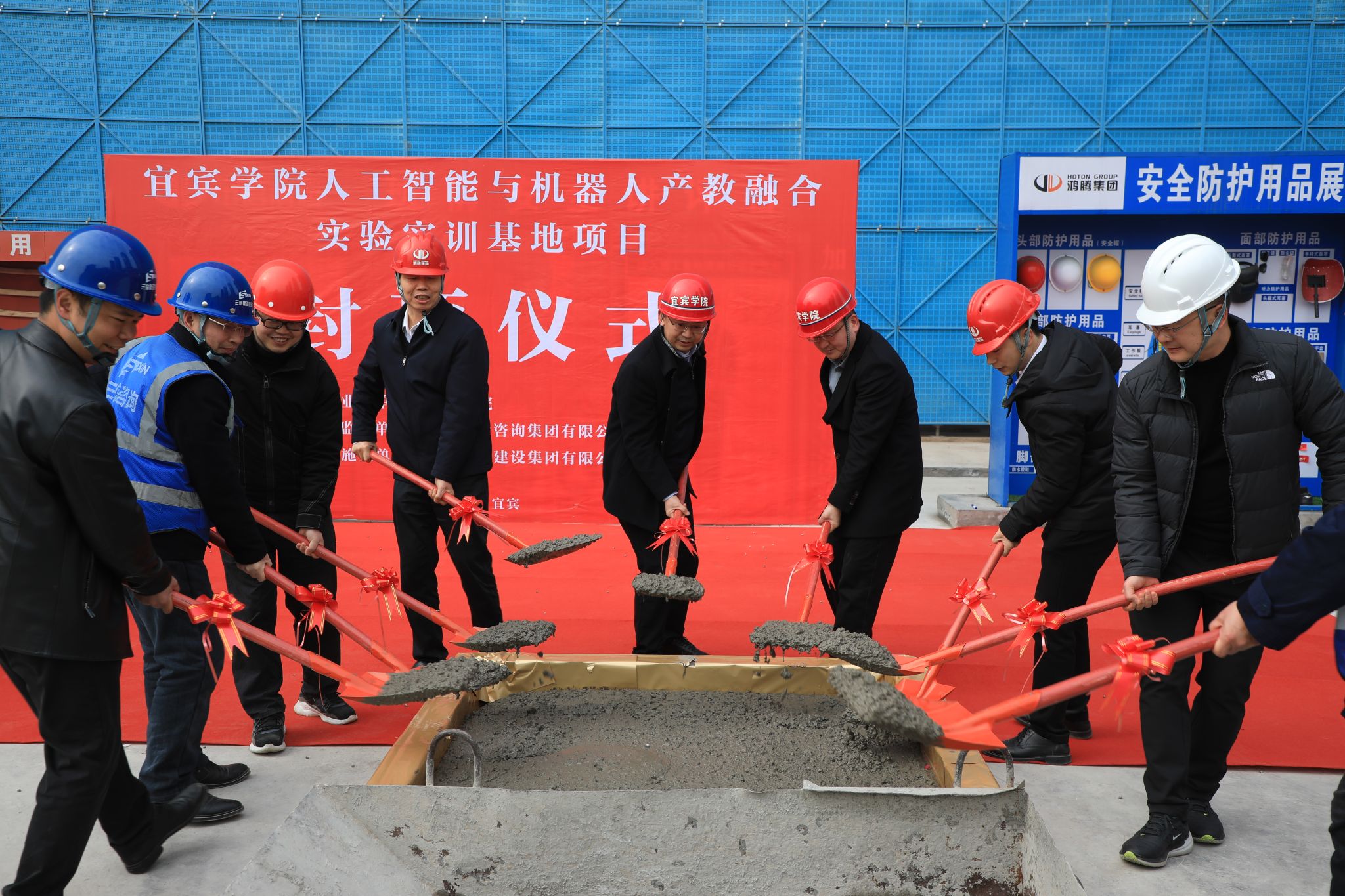 领导们手持金铲共同为人工智能与机器人产教融合实验实训基地项目顶层浇筑最后一方混凝土。伴随着礼炮齐鸣与全场掌声,学校人工智能与机器人产教融合实验实训基地建设项目正式宣告封顶,项目建设进入装饰装修与设备安装阶段。