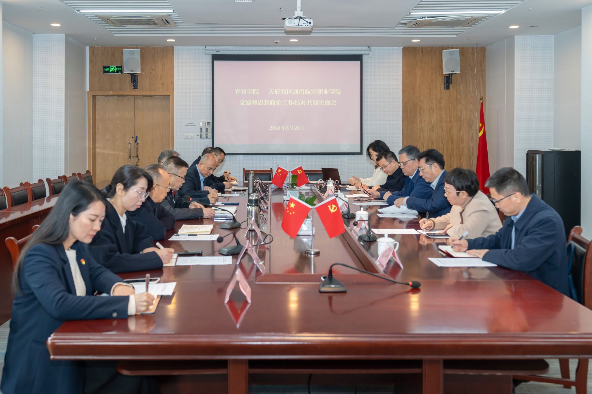 宜宾学院党委书记马洪江率队出席,党委常委、党委组织部部长杨波,党政办、继续教育学院、马克思主义学院等部门主要负责人参加。天府新区通用航空职业学院校党委书记徐诗勤,党委副书记、校长马继刚,执行校长陈晓辉,党委副书记、副校长聂彩林,纪委书记、副校长齐静静等出席会议,会议由聂彩林主持。