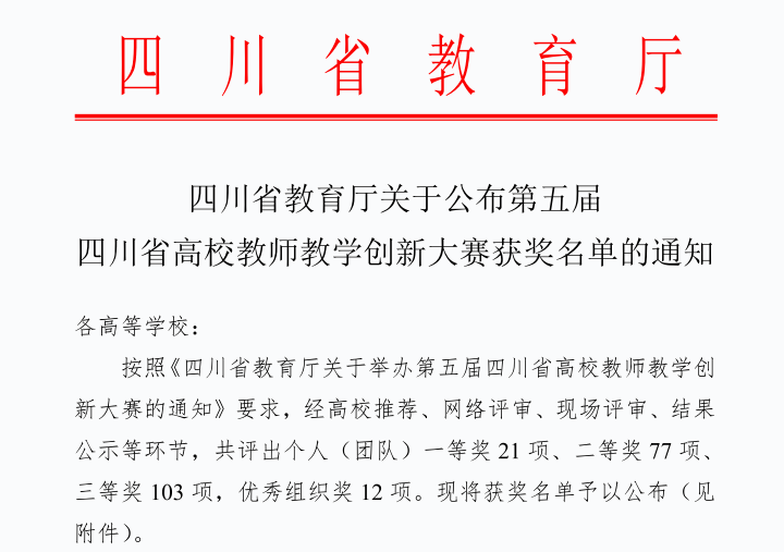 近日,四川省教育厅公布了第五届四川省高校教师教学创新大赛获奖名单,宜宾学院荣获三项奖项,其中两项二等奖、一项三等奖。获奖数量和质量较以往取得了历史性突破,在省属同类高校中名列前茅。