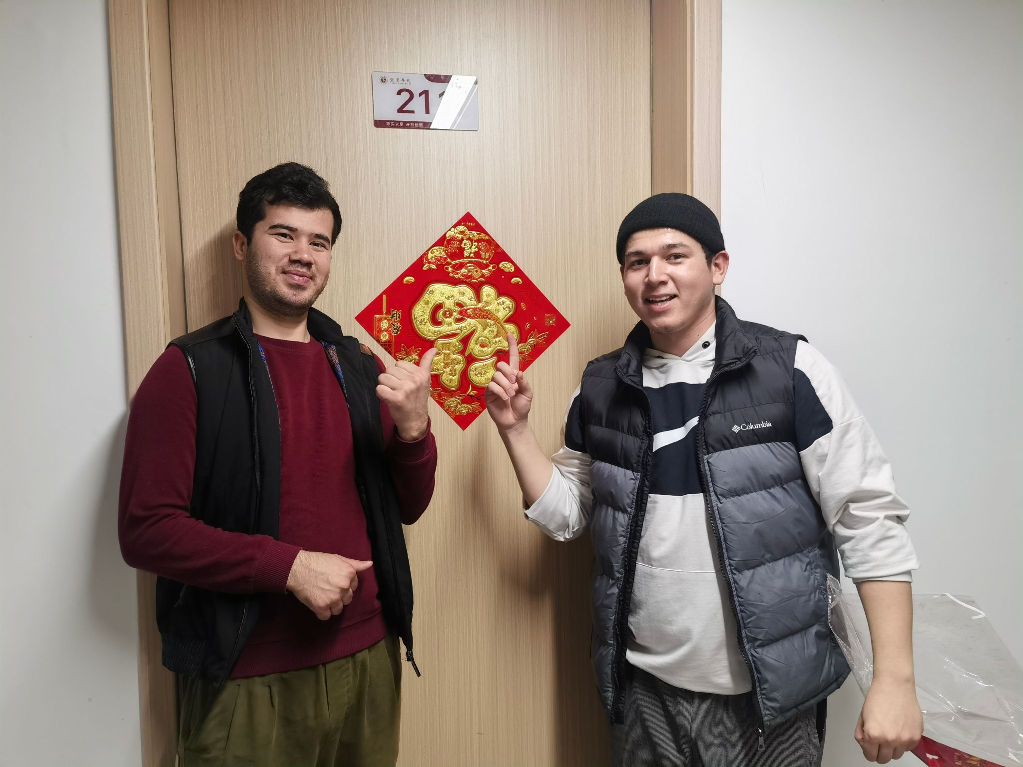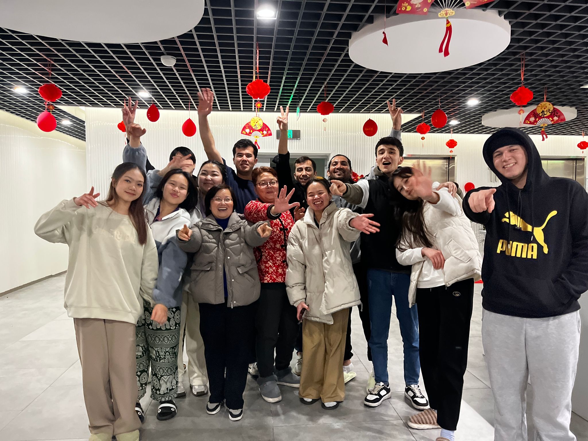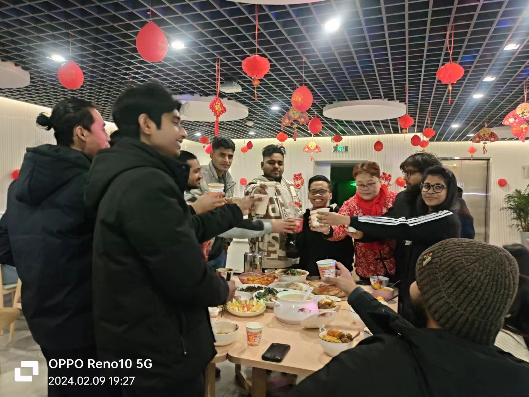 冬日的天气透着浓浓春意,来自老挝、印度尼西亚、孟加拉国、巴基斯坦、乌兹别克斯坦等国家的同学们在春节期间跟随老师们贴福字、剪窗花、挂灯笼、送祝福,他们用这种寄托中国人美好愿望的文化形式表达他们对中国的感谢和喜爱。大年三十的晚上,留学生宿舍大厅摆满了国际学生们亲手制作的食物,大家在此欢聚一堂,不仅品尝了风味各异的各国美食,也进行了热闹和谐的交流互动,加深了彼此的了解和友谊。