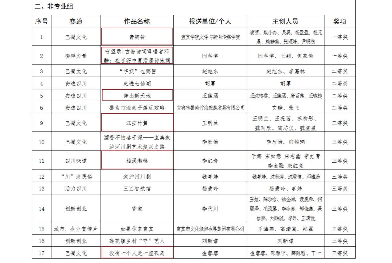 本次活动围绕和美乡村、巴蜀文化、安逸四川、四川味道、“川”流民俗、活力四川、开放四川、榜样力量、创新创业、人工智能活动、城市及企业宣传片等主题展开。经过严格评审,在非专业组,宜宾学院的《守望录|古谱诗词译唱者邓静:在音符中复活唐诗宋词》《青铜铃》荣获一等奖,《舞出新天地》荣获二等奖,《江安竹簧》《柏溪潮糕》《没有一个人是一座孤岛》荣获三等奖。