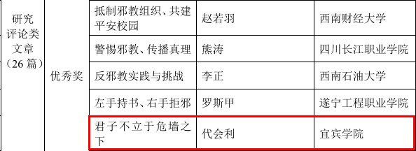 近日,第三届川渝高校反邪教警示宣传教育暨反邪教科普知识网络有奖竞答活动结果揭晓,宜宾学院脱颖而出,荣获“四川省优秀组织单位”称号,并有5项作品在反邪教优秀原创作品评选中获奖,展现了学校在反邪教教育方面的突出成绩。