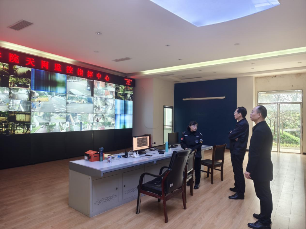 杜正聪听取了保卫处对加强校园安全保卫工作的情况汇报,并对校园安全重点部位110天网监控中心、教学楼及学生公共活动场所进行了检查,详细询问了在关键节点、高峰时段和紧急情况下采取的应急措施。