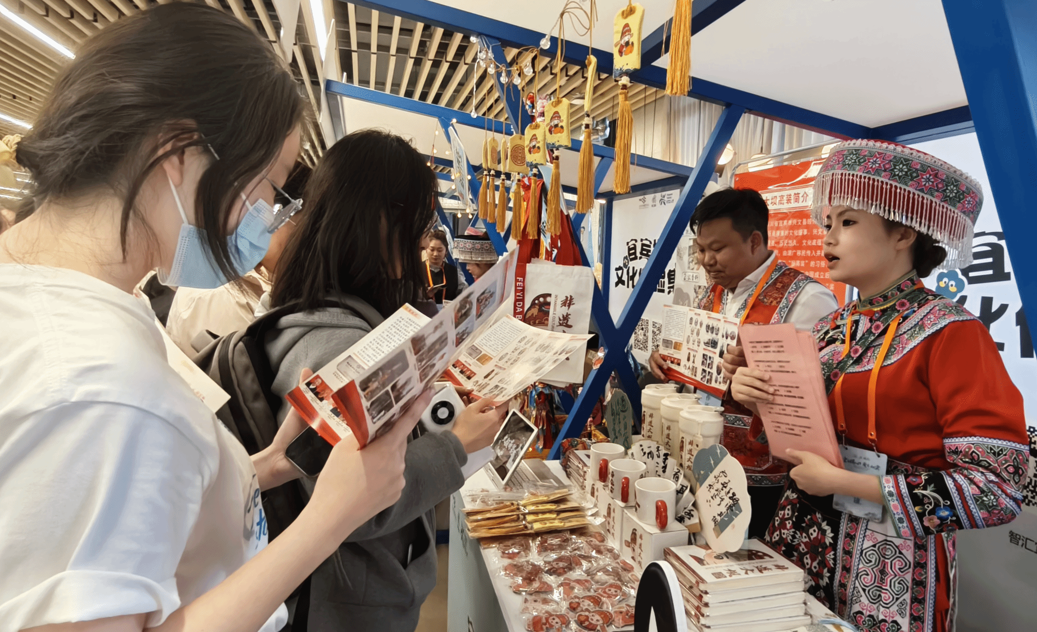 该活动在北大校园内设立了大坝高装非遗小铺,展示了微缩装台模型、非遗文创产品等,吸引了众多师生驻足参观,通过北大这一平台,兴文县非遗文化得到更广泛的传播,此次手工印染工作室团队设计的大坝高装文创产品,既展现了宜宾丰富的非遗资源,同时也促进了高校与地方文化的深度合作。