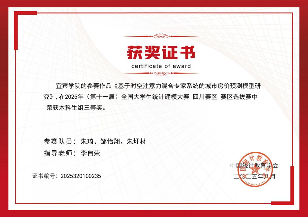 近日,由中国统计教育协会主办的全国大学生统计建模大赛省级评选结果正式揭晓。宜宾学院学子朱琦、邹怡翔、朱圩材组成的参赛团队,凭借严谨的逻辑架构、创新的建模思路与扎实的数据分析能力,使得项目《基于时空注意力混合专家系统的房价预测模型研究》从全省数十所高校的百余支参赛团队中脱颖而出,荣获省级三等奖,为学校赢得了荣誉。