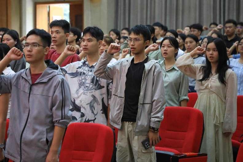 教师教育学院2022级小学教育专业陈旭代表支教学生发言。他表示,作为当代新青年,应当为社会做一些力所能及的事。102位顶岗支教学生庄严宣誓,覃凤清向顶岗支教团队授旗,标志着此次支教之旅正式拉开帷幕。