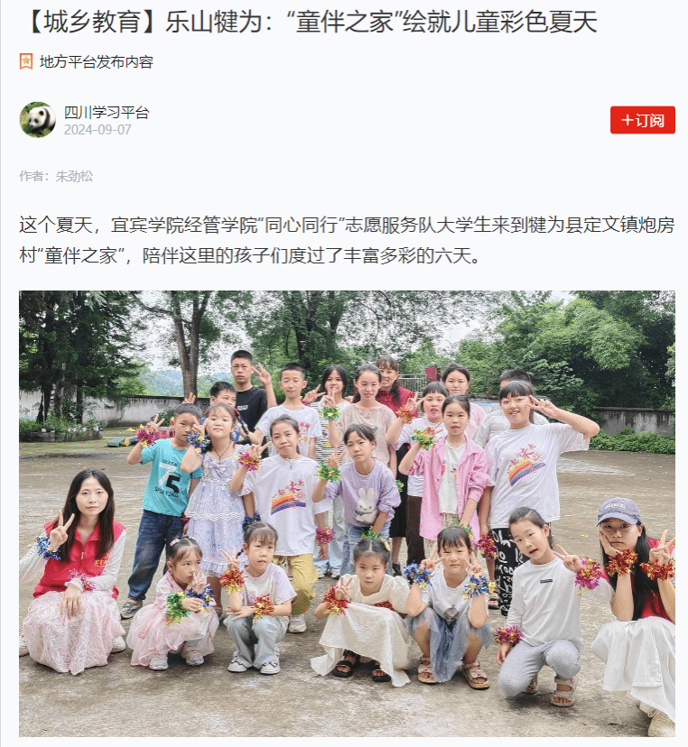 今年暑假,宜宾学院经济与工商管理学院“同心同行”志愿服务队前往乐山市犍为县定文镇炮房村“童伴之家”开展暑期“三下乡”社会实践活动。“学习强国”学习平台专题报道了这一暑期志愿社会实践活动。