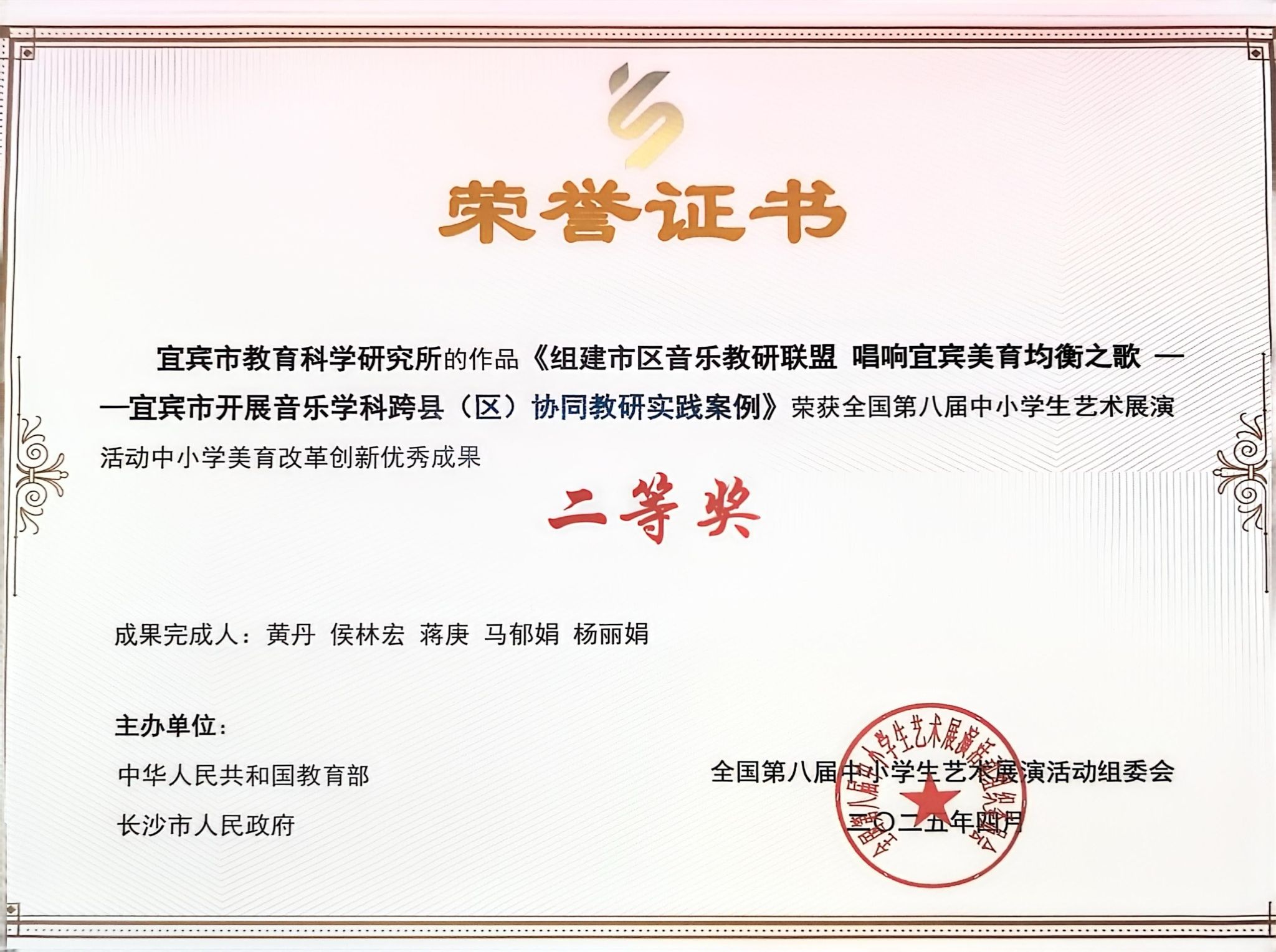 近日,教育部揭晓全国第八届中小学生艺术展演活动评选结果,由宜宾市教育科学研究所牵头,我校音乐与表演学院青年教师侯林宏博士参与完成的《宜宾市开展音乐学科跨县(区)协同教研实践案例》荣获美育成果二等奖,并于4月24日-27日在长沙全国展演现场精彩呈现。