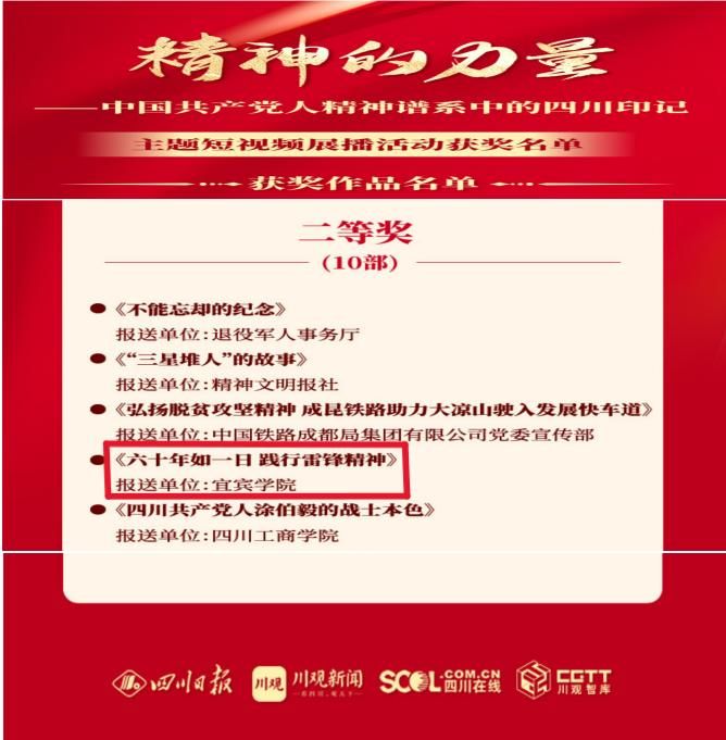 近日,四川省委党史研究室组织开展的“精神的力量——中国共产党人精神谱系中的四川印记”短视频展播活动公布评选结果。我校党委宣传部选送作品《六十年如一日 践行雷锋精神》荣获二等奖。