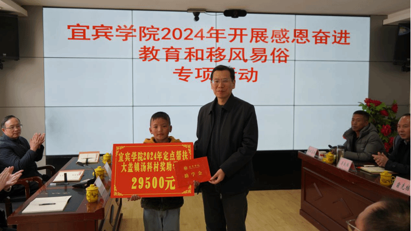 座谈会上,宜宾学院向大盖片区寄宿制学校捐赠了新生冬季校服,向大盖镇汤科村籍学生发放了奖、助学金,向汤科村捐赠了建设“平安乡村”、适用于森林、草原火灾的便携式消防器材。