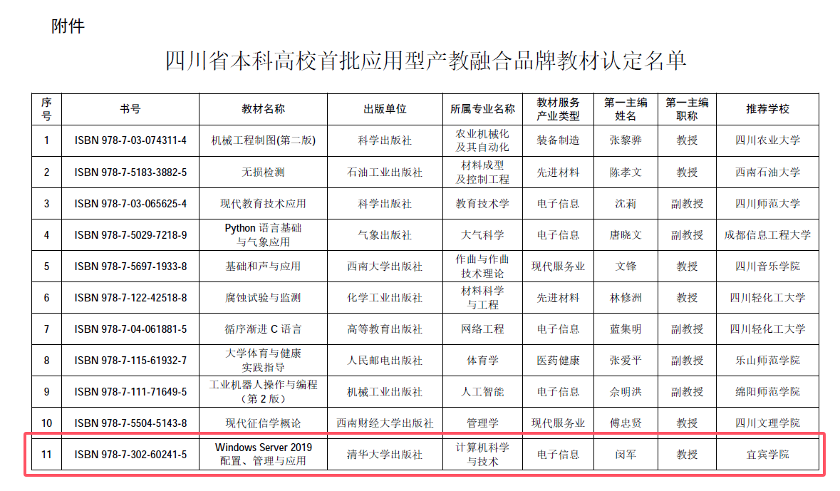 近日,四川省教育厅下发《四川省教育厅关于公布高校首批应用型产教融合品牌教材认定名单的通知》,我校闵军教授主编的教材《Windows Server 2019配置、管理与应用》被认定为四川省高等学校首批应用型产教融合品牌教材。