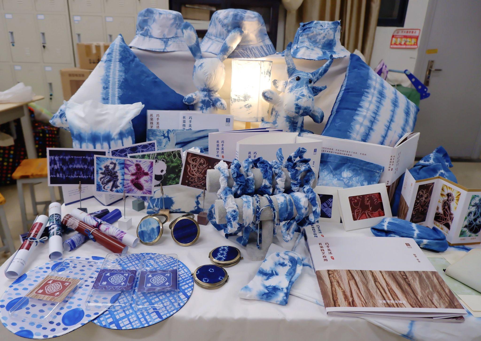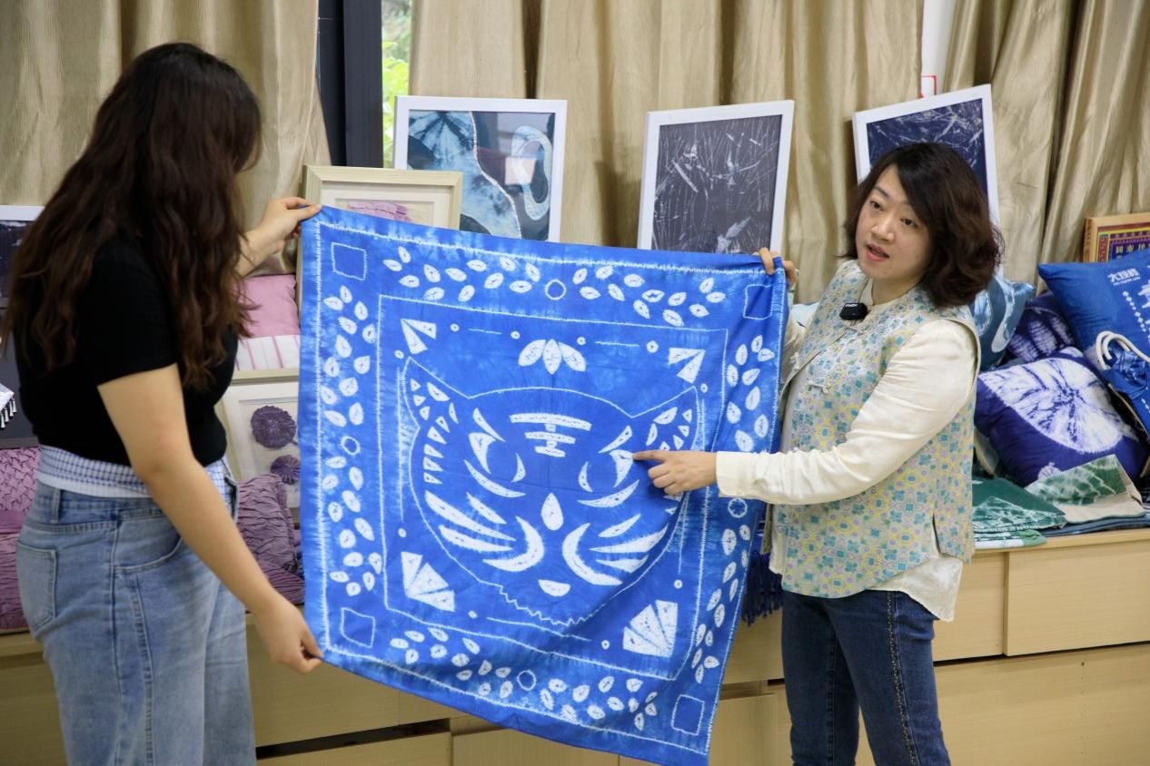 手工印染工作室以零门槛的免费教学向全校学生开放。深夜的线上指导、手把手的纹样设计成为常态。“只要有人想学,我就愿意一直教下去。”范韵老师用行动打破了传统技艺与年轻人之间的壁垒。工作室还打造“展、学、研、创”融合平台,通过跨区域文化互动与文创成果转化,让古老的扎染技艺焕发新的生命力。