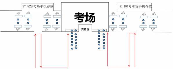 查看考场(19日)以及考试当天(20、21日),考生需将携带的手机等物品放在考点封闭区外的手机存放处,通过智能安检门进行安检,安检合格后方可进入考场。为保证考试当天考生有序完成考前进场安全检查工作,请各位考生在查看考场之前配合现场工作人员完成安全检查演练。手机存放处在考试楼栋两侧。