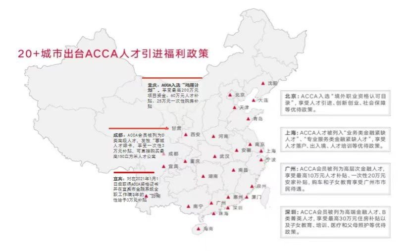 ACCA执业资格在国内被广泛认可,包括北京、上海、广州、深圳、成都、西安、重庆、天津、厦门等全国众多一二线城市均将ACCA持证人员列入当地高端紧缺金融人才目录,争相出台诸如积分落户、个税减免、专项奖金、置业补贴、子女入学等各项ACCA人才引进福利政策。