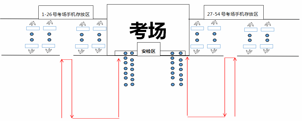 考试当天考生需要将携带的手机等设备放在考点封闭区外的手机存放处,然后再通过智能安检门进行安检,安检合格后方能进入考汤。为保证考试当天考生有序完成考前进场安全检查工作,请各位考生在查看考场之前配合现场工作人员完成安全检查演练。手机存放处在考试楼栋两侧。