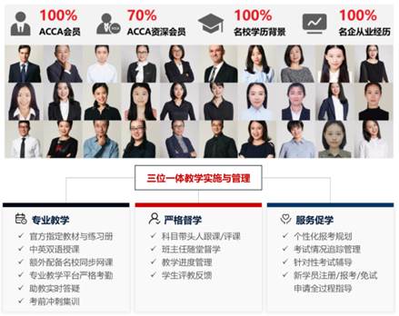 ACCA授课师资均为名企从业经验丰富的ACCA持证人,部分还是全球统考命题人和评卷人;教学采用英文原版教材和练习册,中英双语授课,并额外配备专职班主任与助教老师,学习全过程辅导,及时扫除知识盲点;免费配备与众多双一流高校同步使用的ACCA网络课程,帮助同学们高效学习与备考。
