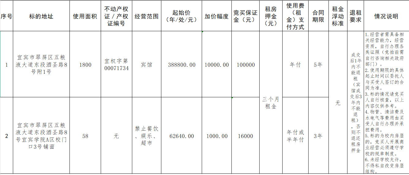 经四川省机关事务管理局批准,四川中成信蓉拍卖有限公司拟于2025年5月30日10时起在四川省公共资源交易信息网(四川省国有资产处置网上交易系统,网址:http:// ggzyjy.sc.gov.cn),以网络竞价方式,对宜宾市翠屏区五粮液大道东段酒圣路8号附1号(宾馆)、A 区校门口3号两处国有房屋进行公开出租。
