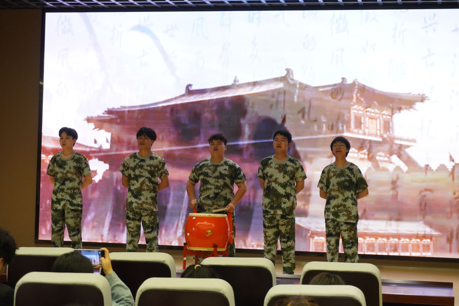 当身穿军训服打着军鼓的同学出场,用雄浑的男声吟诵着王昌龄的《出塞》,现场观众在“但使龙城飞将在,不教胡马度阴山”的吟诵声中,感悟着唐代军士们对和平的渴望,对家国的担当。