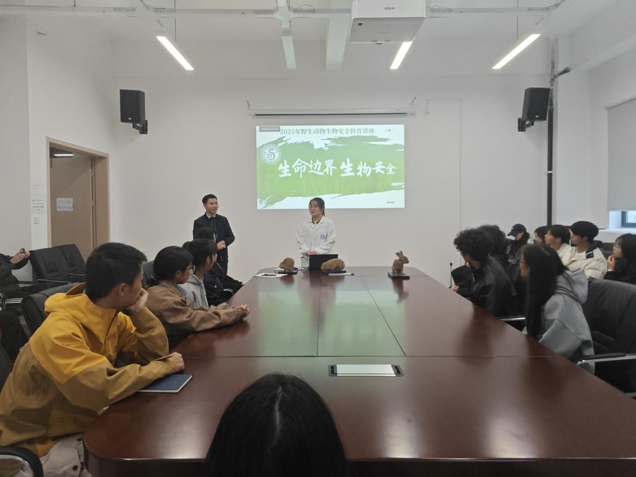 室、科普知识讲解和竞答等方式开展。活动伊始,同学们走进动物多样性与生态保育宜宾市重点实验室,实验室老师向同学们介绍了野生动物生物安全基本概念、常见的人兽共患病类型、外来有害生物的防控、野生动物疫源疫病防控等知识,并带领大家参观精密的检测仪器以及救助的野生动物,并强调“不接触、不投喂、保持距离并及时上报”的安全防护原则。讲座过程中,实验室科研人员以丰富的图片和视频资料,重点介绍了禽流感、狂犬病、布鲁氏菌病等常见野生动物疫病的病原体特性、传播途径,同时详细讲解了日常生活中防范野生动物疫病的具体措施。此外,在志愿者的带领下,通过动物科普图片展、实物标本展示及互动问答,生动讲解珍稀动物的形态特征与保护价值,现场互动氛围十分热烈。