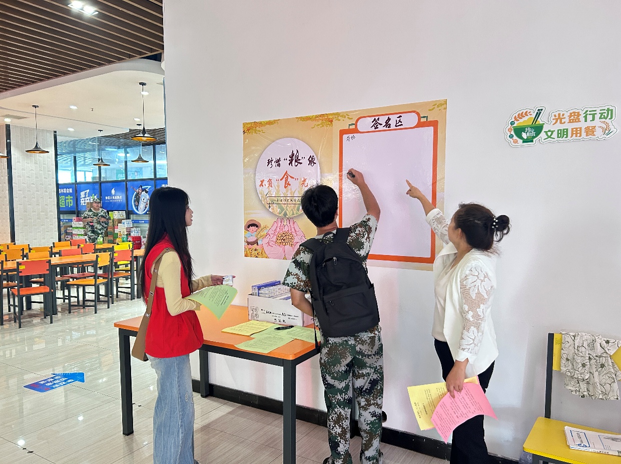 活动现场工作人员和学生志愿者向师生派发食品安全科普知识宣传单;通过扫描二维码参与食品安全知识问答;线上发起“尚德守法共享食安随手拍”活动集赞领奖;组织师生参与“光盘挑战”并签名承诺等等,本次活动得到了广大师生的积极响应和支持,校园中处处萦绕着厉行节约的浓厚氛围。
