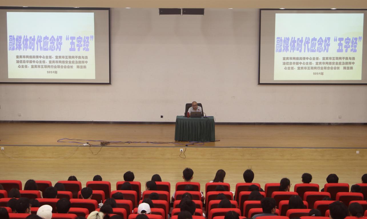 为深入学习贯彻习近平总书记关于网络和信息化工作的重要论述,进一步提升青年网络安全防范意识和网络安全防护能力,努力营造一个安全、和谐、美好的网络环境,5月18日下午,宜宾学院青马班在临港校区一期求是会堂开展“融媒体时代应念好‘五字经’”网络舆情专题讲座。本次讲座由赵一曼学院客座副教授、四川省网信人才培养基地专家、宜宾市网络舆情中心主任陈亚鹏主讲,青马班第五期全体学员参加。