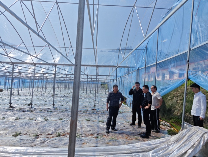 杨强一行首先来到屏山镇柑坳村农业大棚项目基地。结合大棚基地现有基础设施和种植情况,建议进一步优化种植结构,引进高附加值经济作物,构建多品类轮作体系,提升亩产效益;同时,阶梯式设施改造,按自动化需求分层次合理配置资源,提高生产效率。