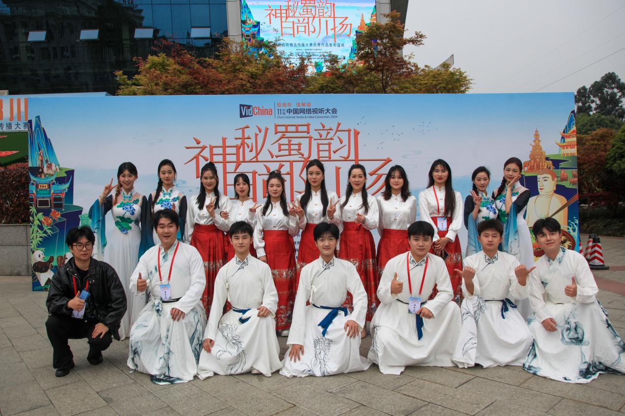 近日,第十一届中国网络视听大会首场活动“神秘蜀韵 百部川扬”网络视听精品传播大赛优秀作品颁奖盛典在四川传媒学院艺体中心成功举办。本次活动由四川省广播电视局、四川省财政厅主办,四川省网络视听协会、四川传媒学院等单位承办,宜宾学院受邀参演,在校团委和文艺学部的大力支持下,邓静老师带领16名学生圆满演绎了苏轼古谱诗乐舞作品《定风波·莫听穿林打叶声》。