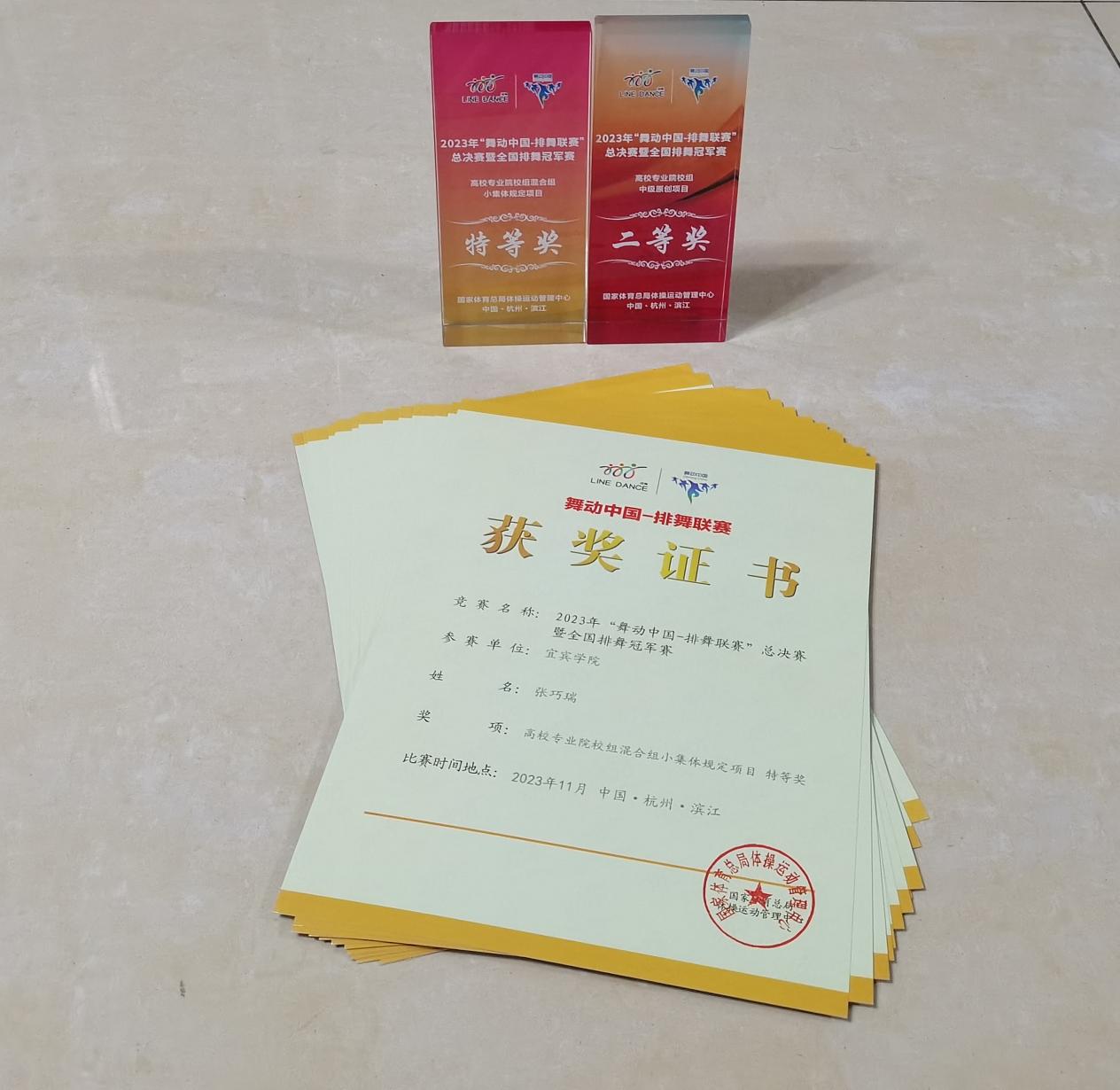 教练组在技术动作与音乐创编过程中巧妙融合了宜宾地方特色文化,原创具有苗族风格排舞曲目《铁路修到苗家寨》获本次比赛“原创排舞十佳作品”。经过激烈角逐,最终斩获高校专业院校组混合组小集体规定项目特等奖、中级原创项目二等奖。