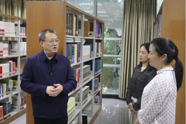 在蔡乐才的陪同下,邓瑜一行参观四川省方志馆宜宾学院分馆,了解馆内藏书情况,讨论地方志的价值。