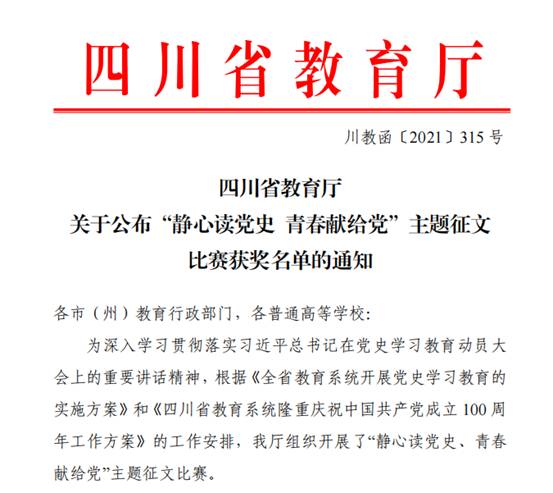 为深入学习贯彻落实习近平总书记在党史学习教育动员大会上的重要讲话精神,引领广大青年学生学史明理、学史增信、学史崇德、学史力行,四川省教育厅于2021年4月面向全省大中小学生开展了“静心读党史、青春献给党”主题征文比赛。我校学子踊跃投稿,以鲜活的文字书写青年学生的责任与担当,重温红色记忆,传承红色基因。