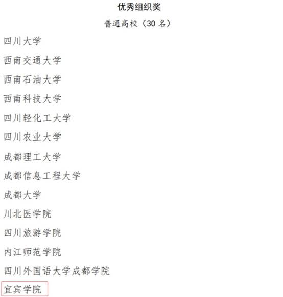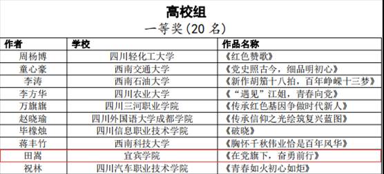 经过校级初赛、复赛,最终推送5篇优秀作品角逐省赛。其中质量管理与检测检验学部田嵩的《在党旗下,奋勇前行》获高校组一等奖,法学与公共管理学部黄夕桂的《党颂·我与你》获高校组三等奖,文学与音乐艺术学部封晓琪的《红烛心向党,建功新时代》获高校组优秀奖,宜宾学院获优秀组织奖。