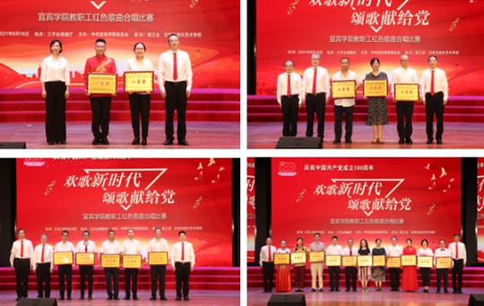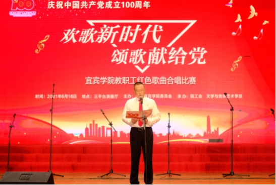 为热烈庆祝中国共产党成立100周年,深入开展党史学习教育,激发师生爱党爱国爱社会主义的情怀,6月16日下午,由中共宜宾学院委员会主办、院工会与文学与音乐艺术学部承办的宜宾学院“欢歌新时代、颂歌献给党”教职工红色歌曲合唱比赛在三平台演播厅举行。党委书记蔡乐才,党委副书记、院长王玲,党委副书记鲁飞,党委副书记、纪委书记徐其虎,党委常委、副院长王藩侯、周广均、王如渊、白玉林,党委常委、党委组织部长华曦,党委常委、党委宣传部长李成文等出席活动,教师和学生代表近500人到场观看比赛,学校官方微博同步直播此次比赛,观看次数近6000次。