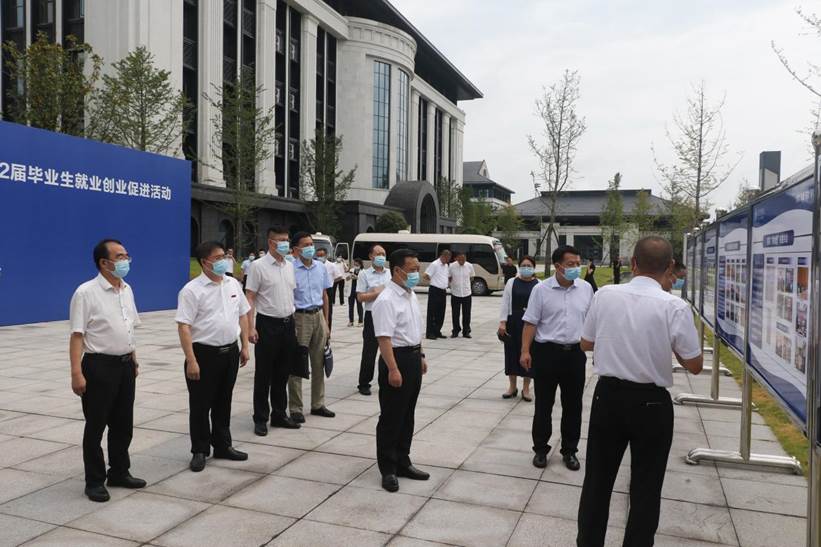 在学校求实会堂,周广均向王洪祥一行介绍了习近平总书记来校考察调研及学校贯彻落实总书记来川视察重要指示精神相关情况,学校毕业生就业创业情况等,陪同参观了模拟垃圾智能分类运输机器人展台、智慧农业物联网监控系统、油樟创新展区和就业创业指导服务展区,察看就业指导服务资料,观看“2022届毕业生最后一堂思想政治教育课”视频,重温总书记考察调研宜宾学院相关视频,深刻感悟总书记的关怀和殷殷嘱托。王洪祥一行对学校创新创业成果及较高的毕业去向落实率给予充分肯定,赞扬学校成果特色鲜明,前景广阔。